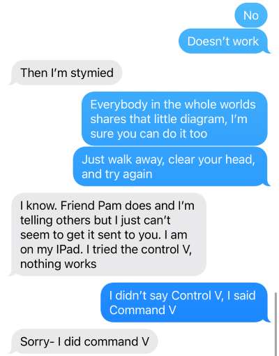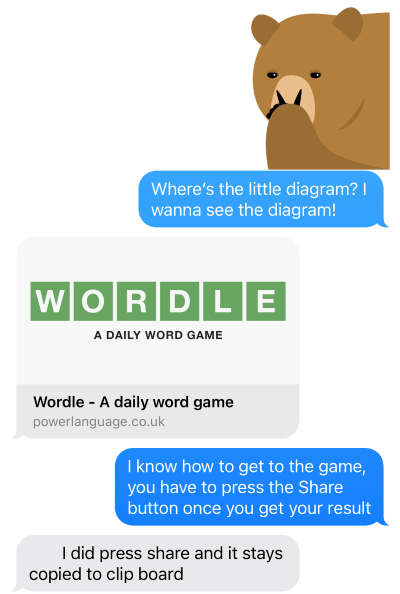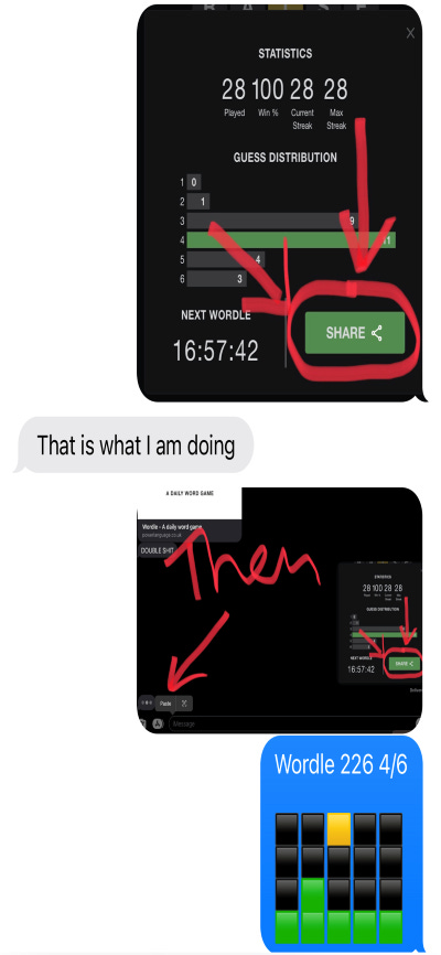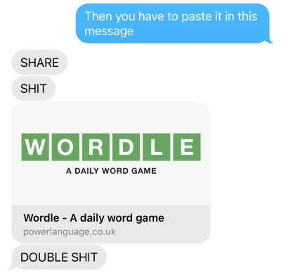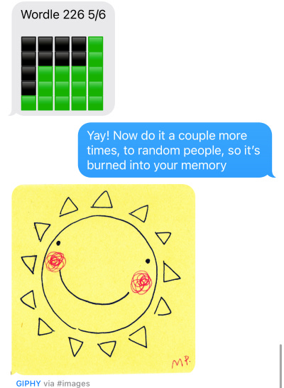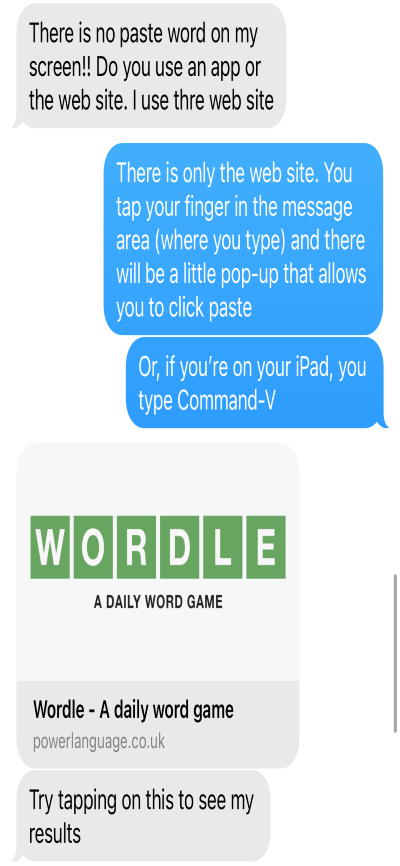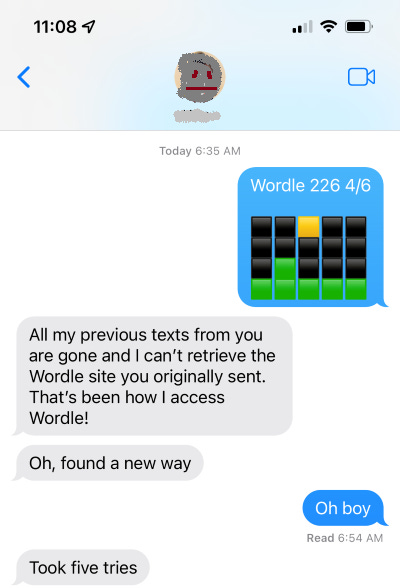 I shared Wordle with someone the other day, which she enjoyed because some of her friends were playing it and now she could join in. We had a few days of sharing back and forth. But today, when I sent her my morning report (that's me, on the right side), we had this exchange: