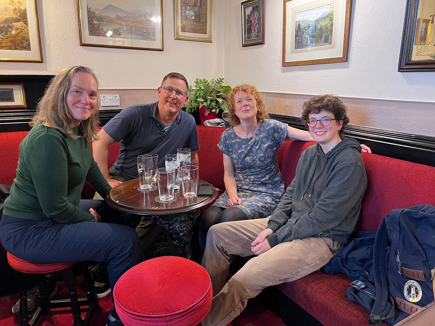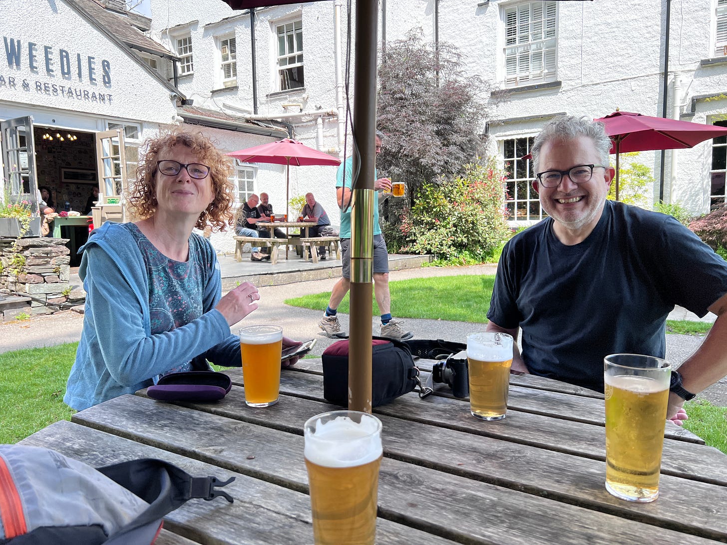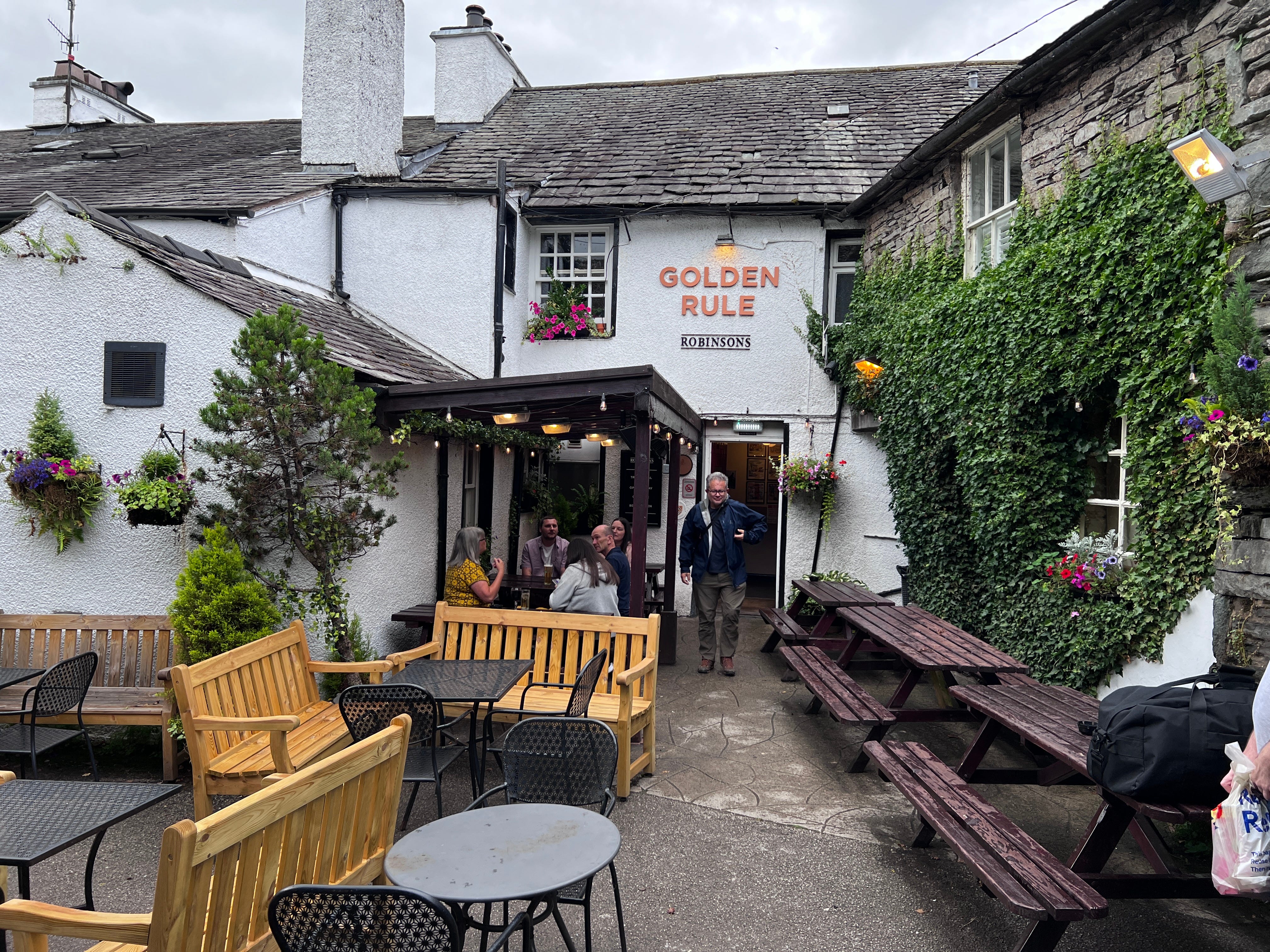 “You’re probably tired,” said they, “ so we’ll just do a short walk2,” and off we went, alongside a stream and through a pasture on one of those impossibly narrow English lanes, thence across a stone bridge for a quick pop-in to see Caitlin, who was working at the tea house at Rydal Mount, where famous English poet William Wordsworth spent most of his later years. Revived by a coffee and a scone served with clotted cream and jam, we then wandered through the grounds of Rydal Hall and down another narrow single-track skirting pastures until we came to Chris’s favorite pub, the Golden Rule, in Ambleside. Sara and I were by this point somewhere out past tired, so far out of sync with the clock that we didn’t know what time it was, and so we happily consented to two pints before we walked home “just a mile.” By 8 pm we sat down to dinner at their house, 6 miles of walking to our credit. And that was just the start.