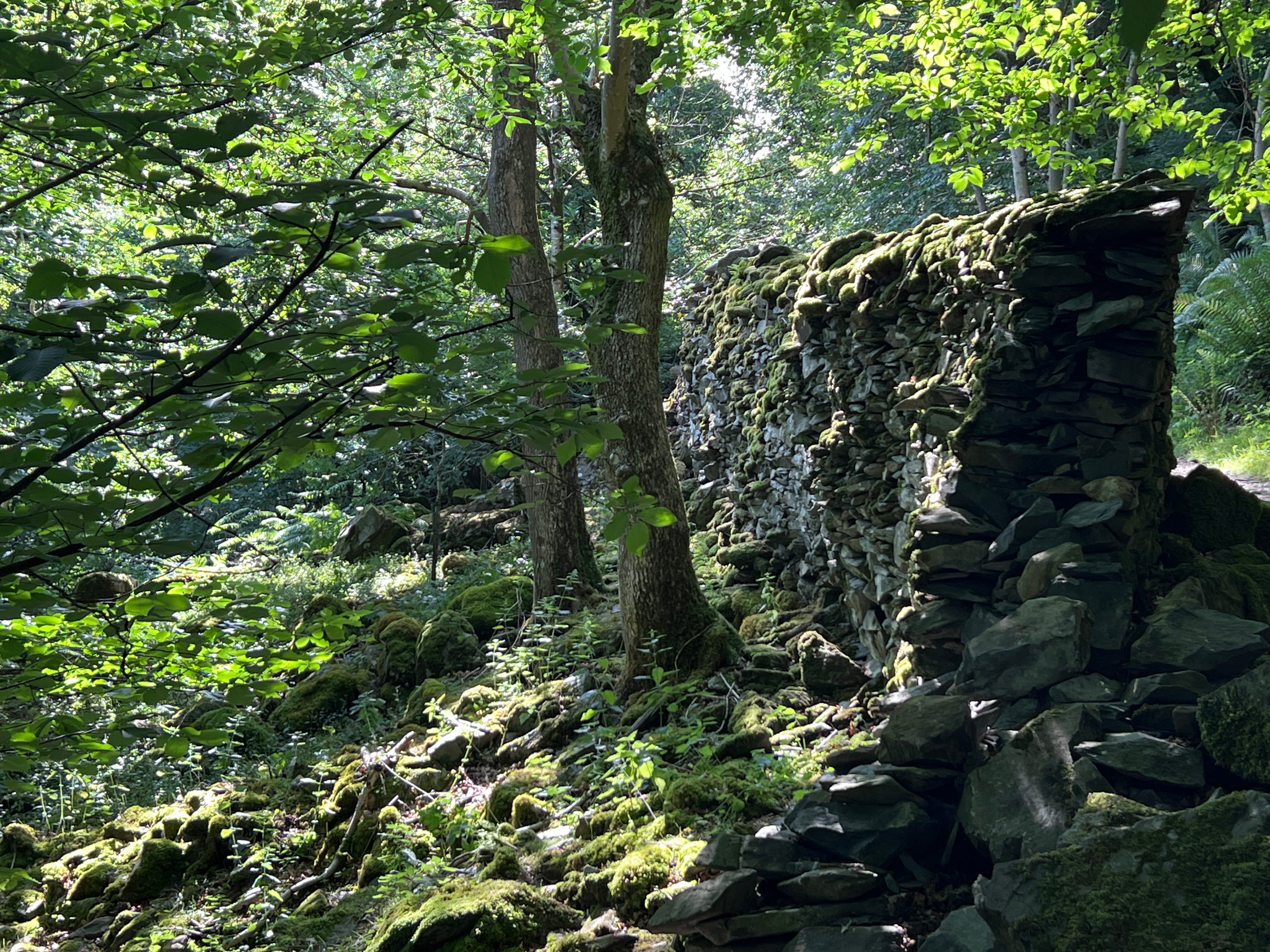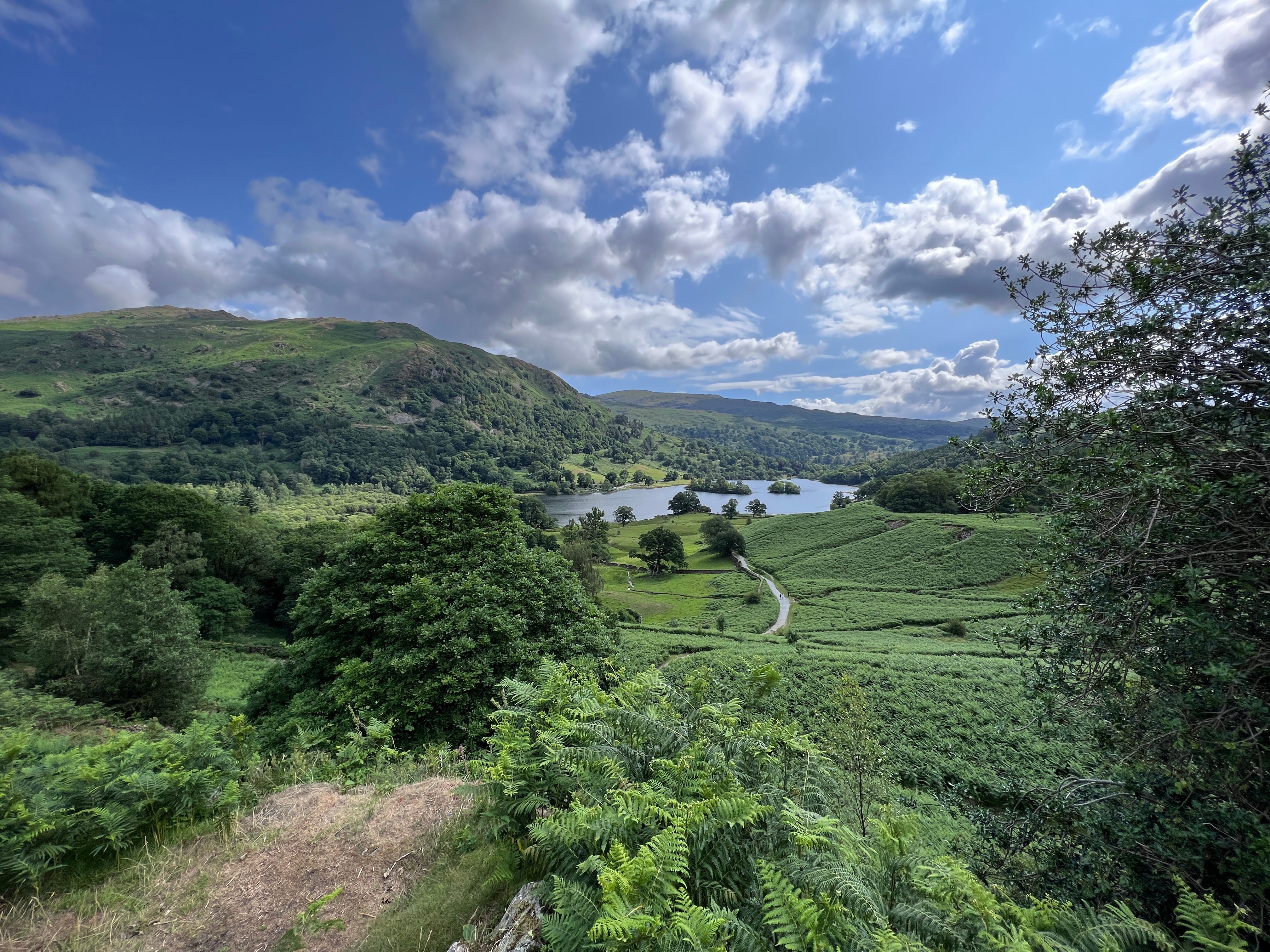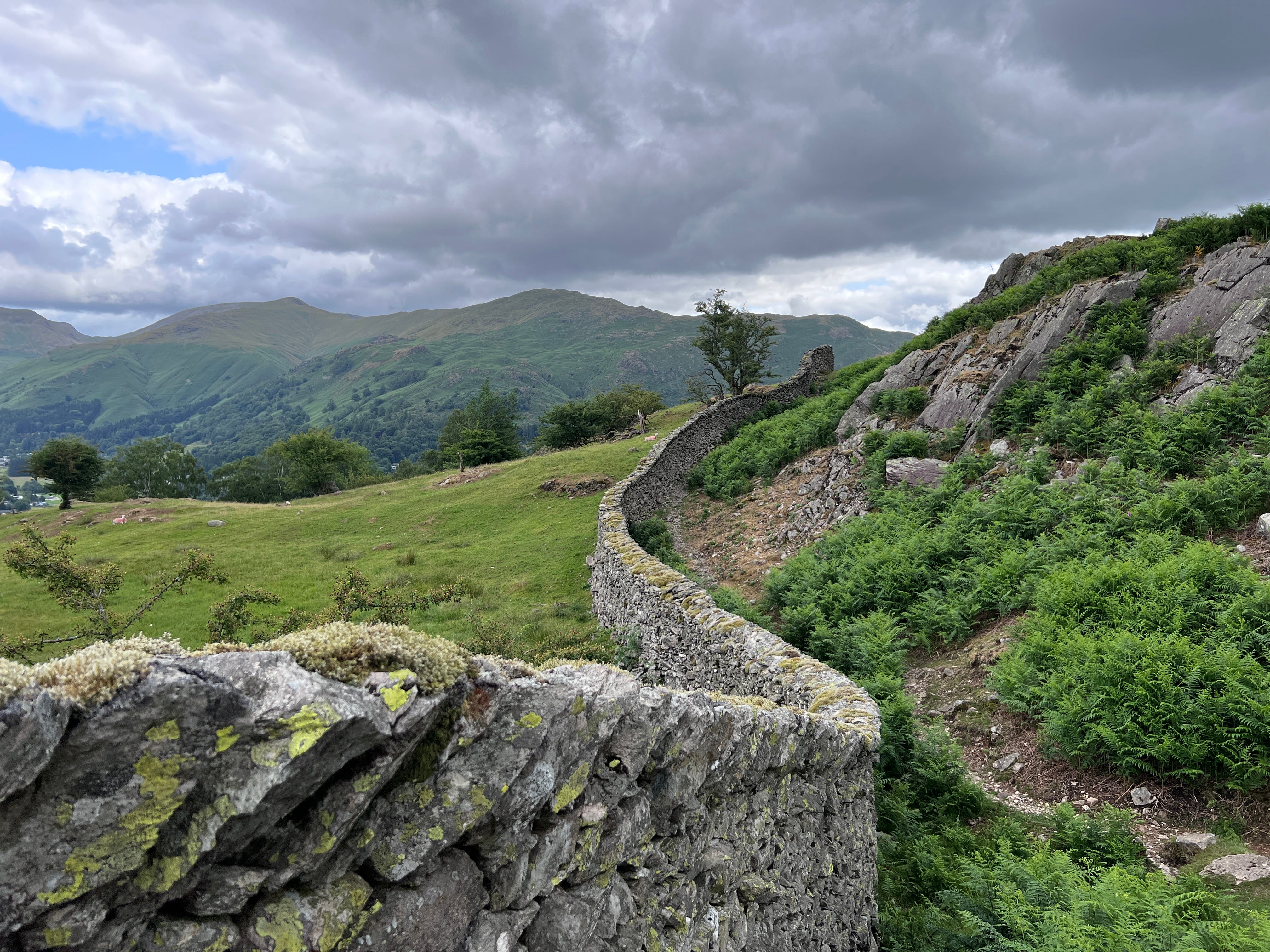 The next day, the real walking commenced, inspired by a quick thumb through one of Alfred Wainwright’s famous guides to the walks of the Lake District. Through the pasture, turn left, through the woods toward Rydal Water (a small lake) and then up, up, up, winding through the ubiquitous waist-high bracken, weaving along and sometimes over the stone walls, up to some “fell” or another, the Stonechats and Eurasian Skylarks providing the musical accompaniment. Eventually we’d ascended some 2,000 feet and could look across the countryside and see higher mountains in the distance, lakes and small villages set in the valley below.