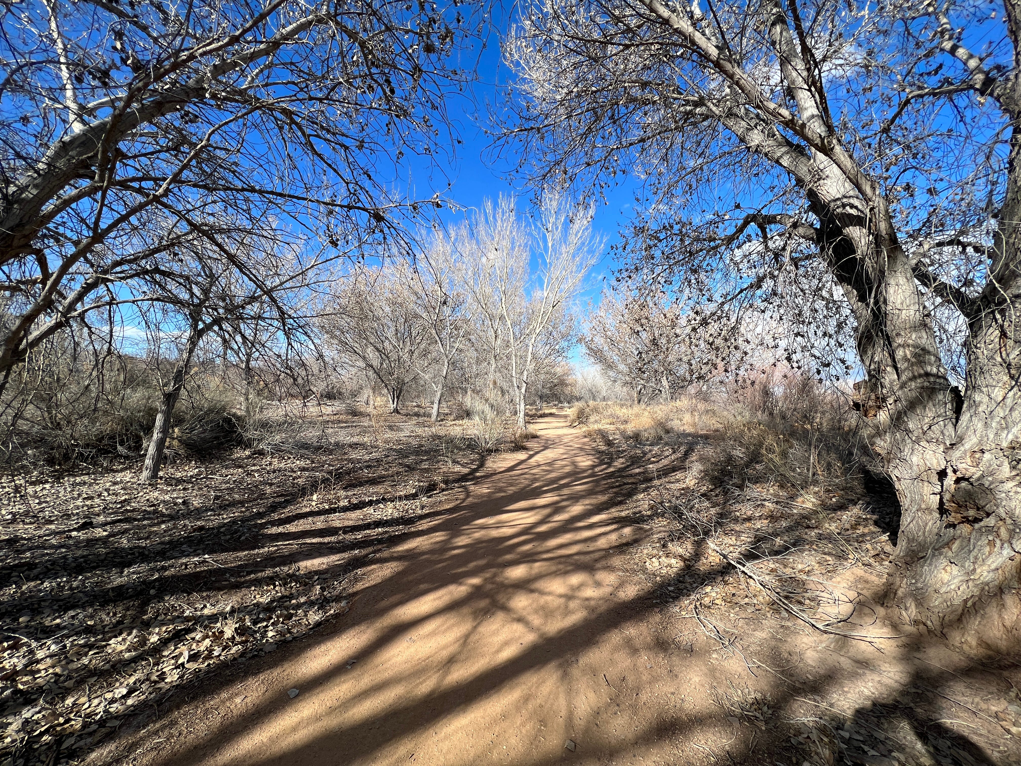 I hit Albuquerque during the dry season, so the only water is in the river and the drains (or “clear ditches”) that run parallel to it. There’s not enough water for the ditches until May (and then it runs until the fall, September or October). So I got to see the ditches when they were filled with tumbleweeds and the sharp black shadows cast by the leafless trees. These dry ditches have got a beauty of their own, especially for a guy from the Pacific Northwest, but I long to see them filled with water.