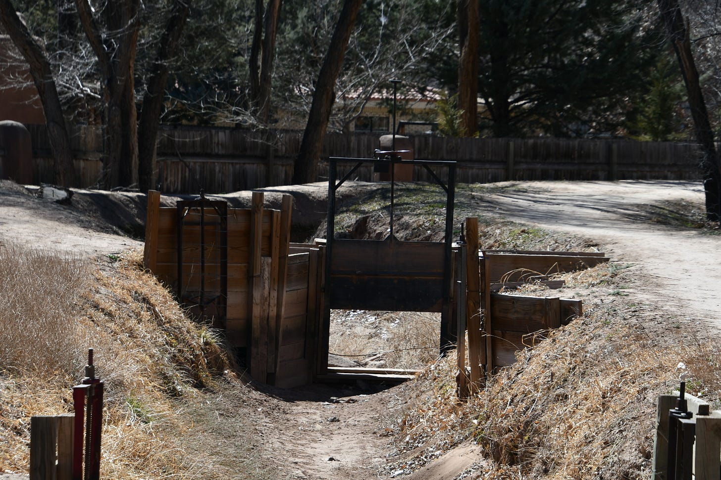 And all along these back yards are wide ditches with dirt paths down either side. Some of the ditches are shallow, just two or three feet deep, but others are so deep you can jump down in them and just barely look out (yeah, I tested it.) The ditches are crossed by gates, their size proportional to the ditch itself. And along the banks are these mechanisms called turnouts that allow the person with the right wheel or wrench to turn the long screw that opens the door to let the water flow out into their yard. You get the wheel when you pay for your water.