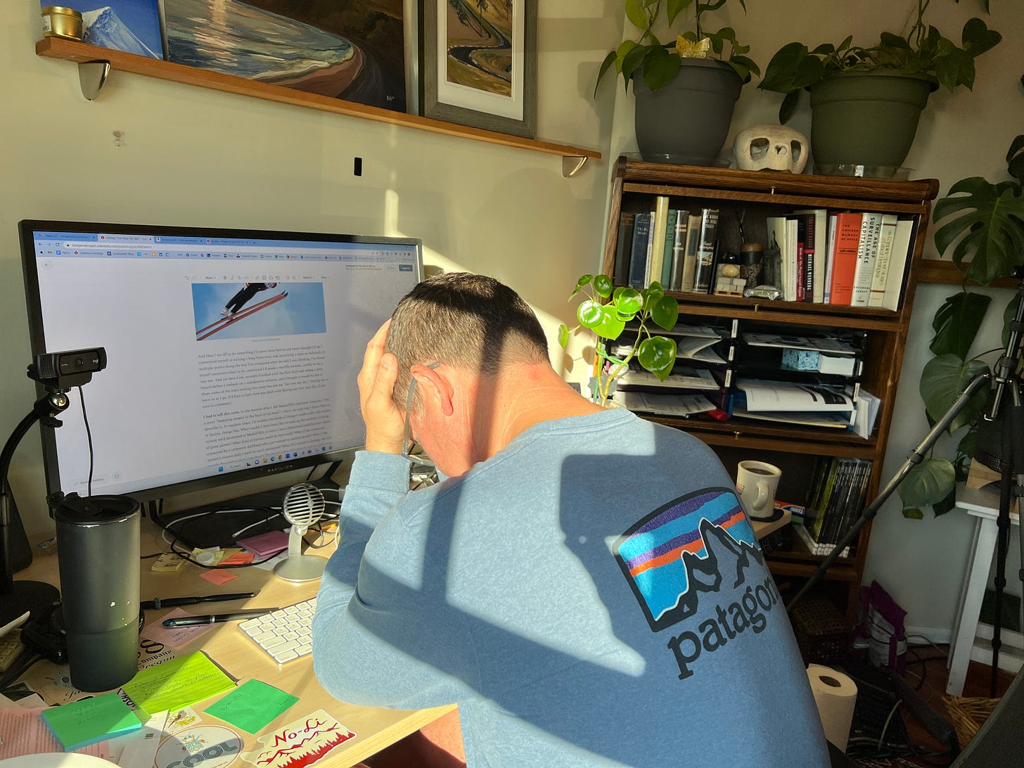 I love being out over my skis. Again and again as I wrote this story I’d exclaim, to myself and to Sara, “This is hard!,” “I don’t know what I’m doing,” “I’m stuck.” If you popped your head into my office, as often as not you’d find me with my elbows on the table, my forehead cradled in my hands, poring over the next problem I had to solve.