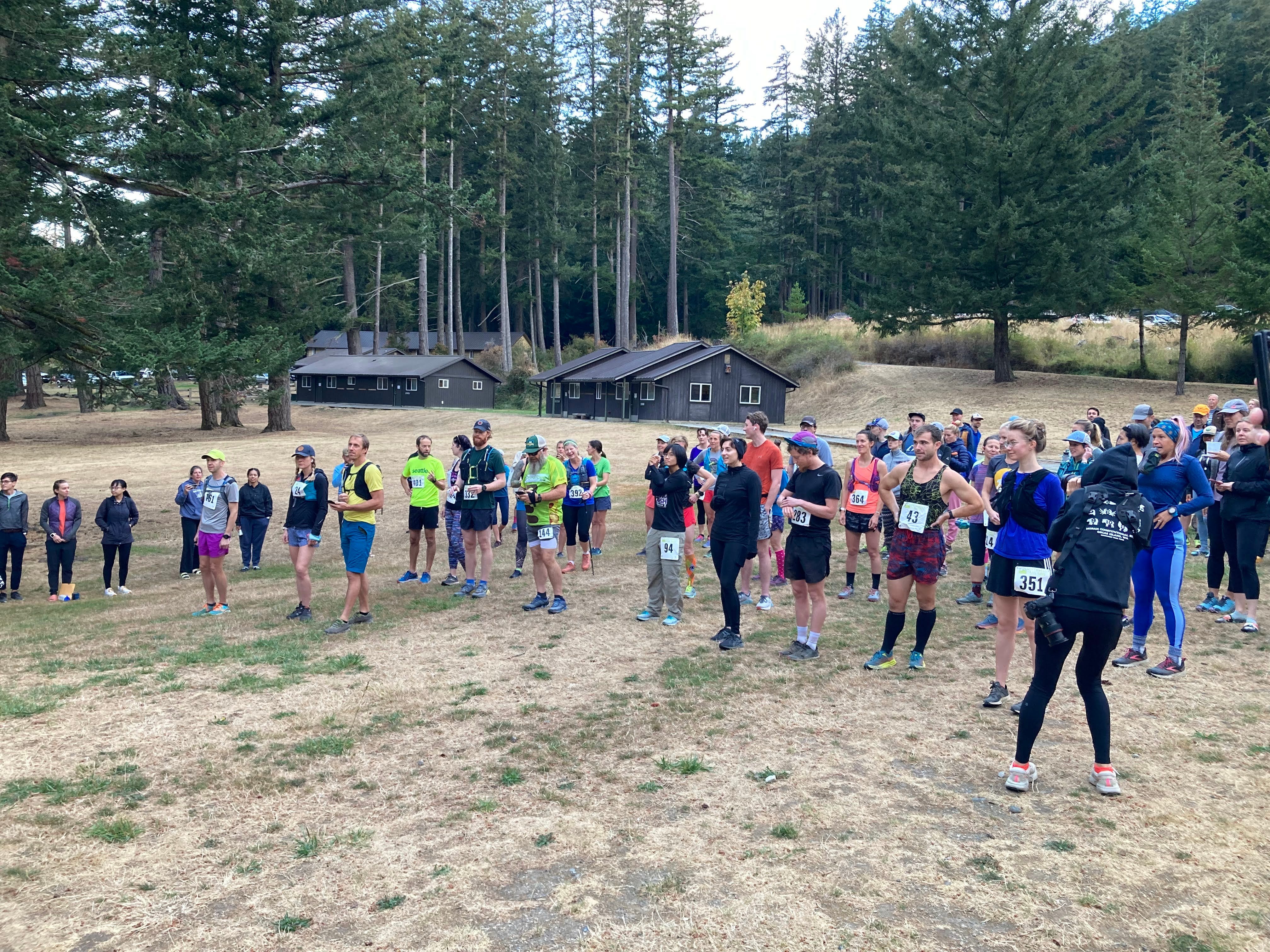 At the start … little did Alex (all black, near center) know that two runners to her left was the fastest guy on the mountain. We nicknamed him Tank Top Guy. Not visible in this shot is our favorite team, nicknamed Cookie Shorts.