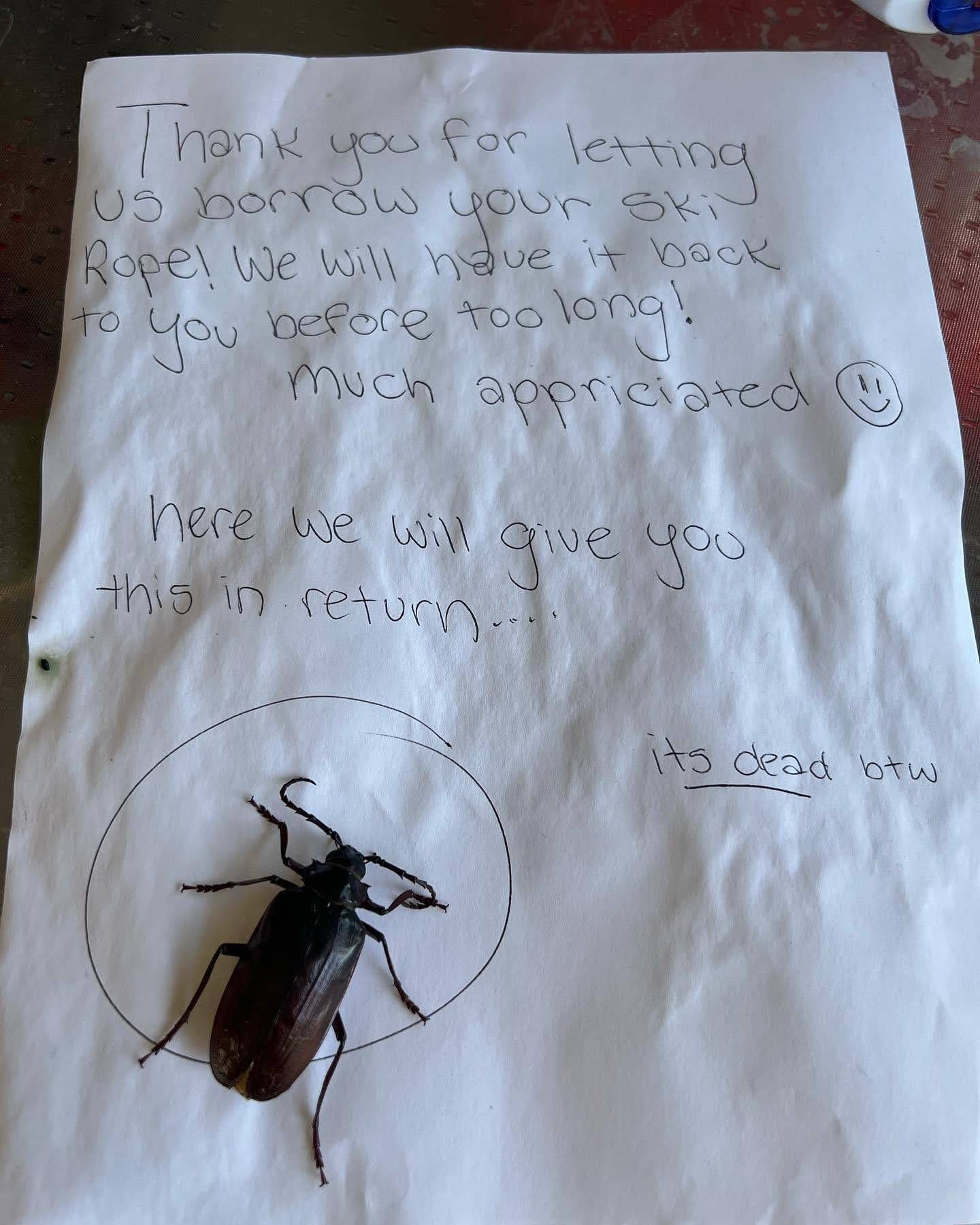 The other day a friend of mine1 posted a picture of this bizarre thank you note he had received after loaning a neighbor a rope to waterski with. Here’s the note: