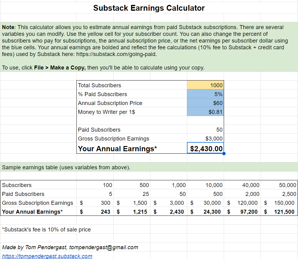 Because I’ve heard from writers that they don’t even reach that lower estimate, I wanted to take a more conservative view. So I built a calculator that counts how many total subscribers I’d need to find 5% willing to pay me $60 a year and lift me to Kelly’s $100,000 target. (You can make a copy of the calculator and play all you want.)