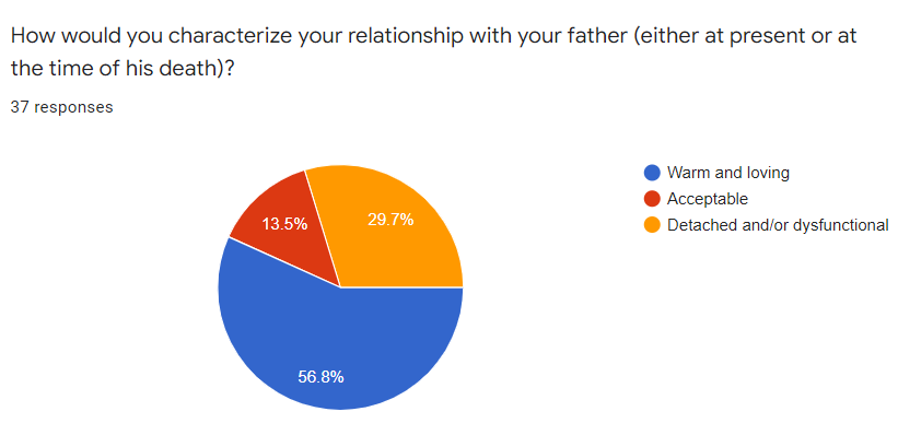 Not nearly as bad as I expected. Nearly 57% of you had warm and loving relationships with your dads (lucky you!), though a sizable minority of just under 30% had detached and/or dysfunctional relationships. That left 13.5% somewhere in between.